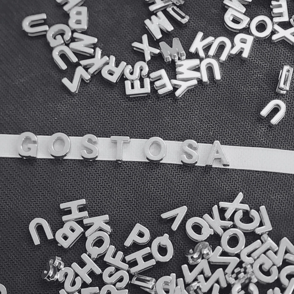 Possui modelagem fio dental de cintura baixa e pernas cavadas, cós com babados sobrepostos e detalhe exclusivo nas costas: letras metálicas douradas ou cromadas. O grande diferencial é a possibilidade de escolher entre palavras prontas ou personalizar nomes e frases de impacto via WhatsApp.