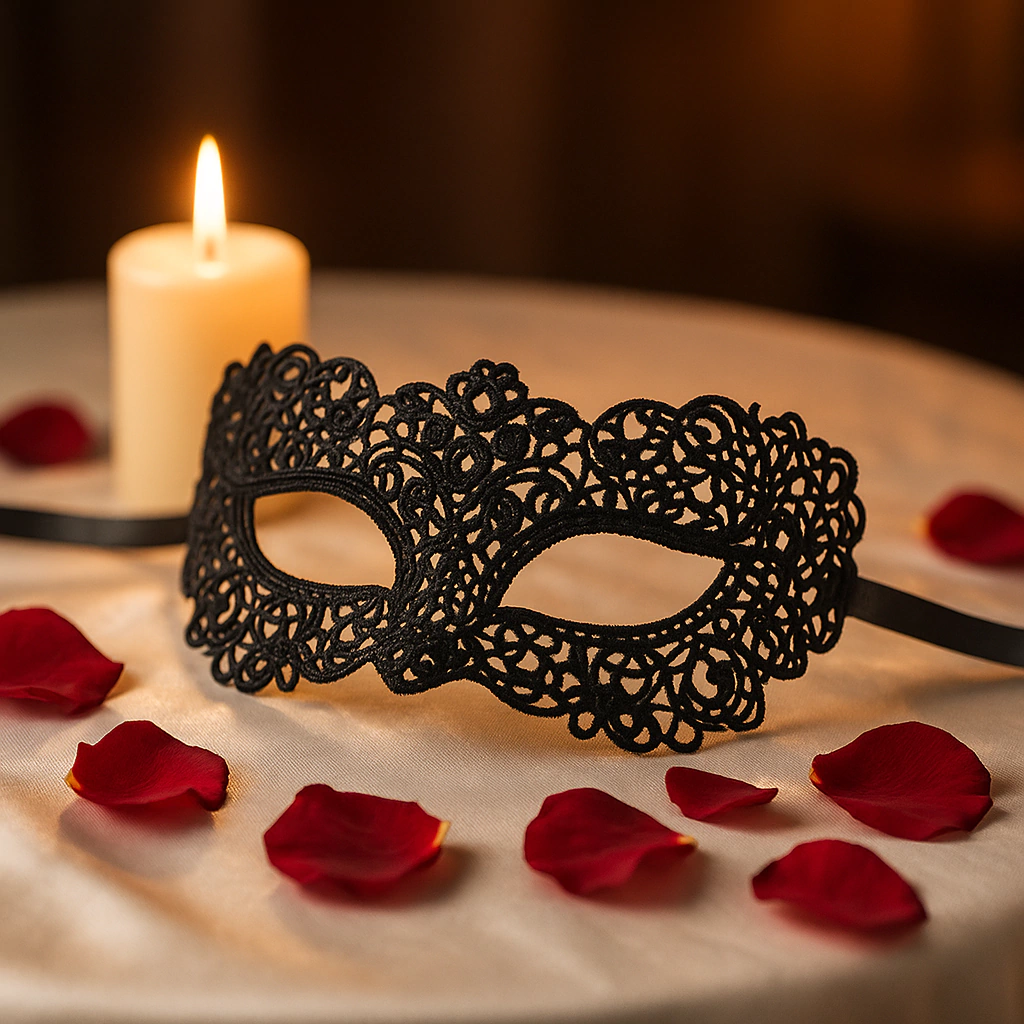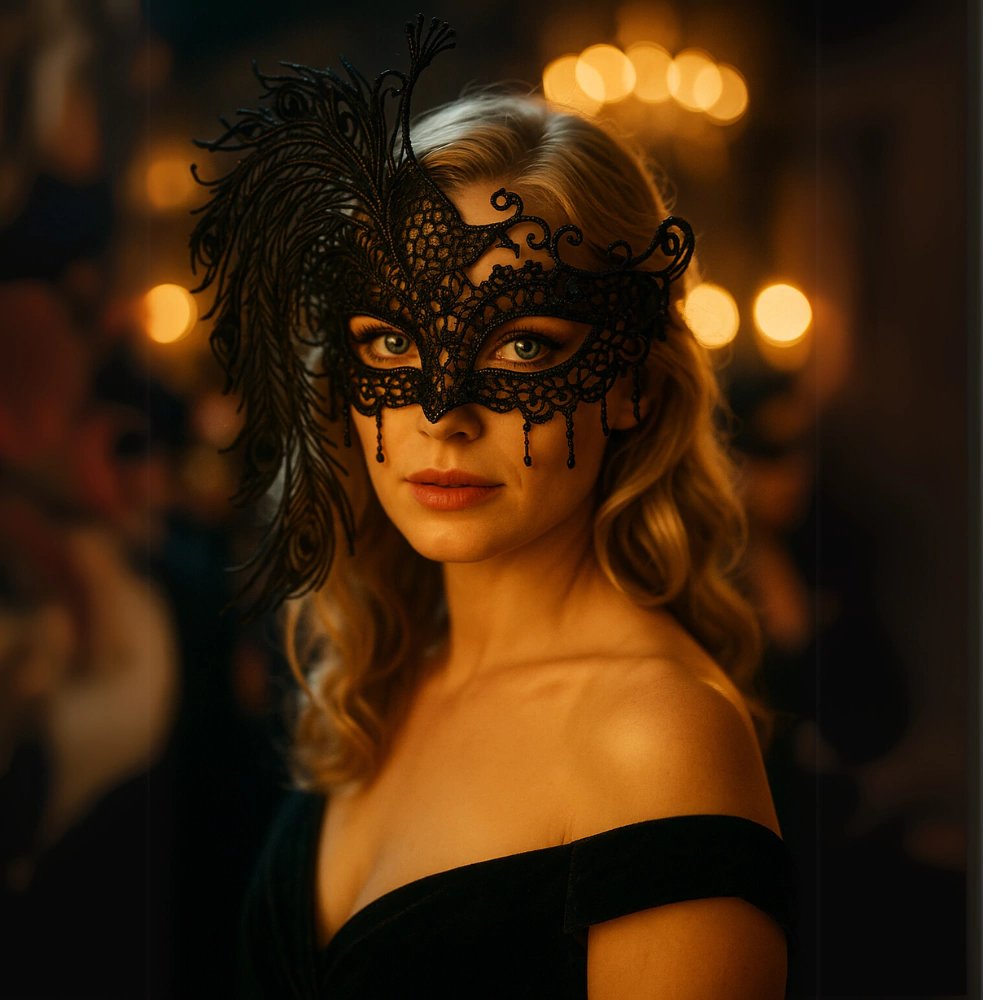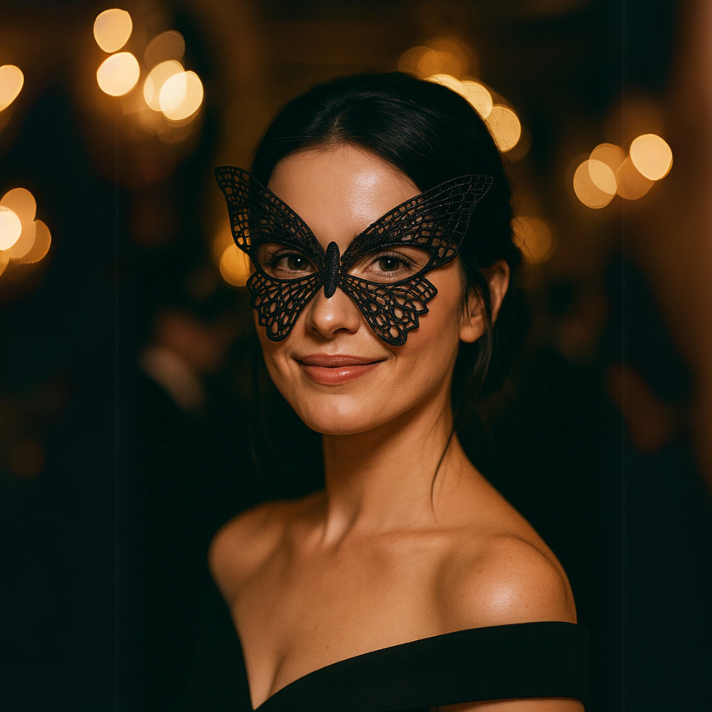 Máscara estilo veneziano em renda preta leve, com estrutura ajustável através de fita de cetim. Produto ideal para revendedores que desejam oferecer acessórios versáteis e elegantes para festas, casamentos, bailes ou uso sensorial.