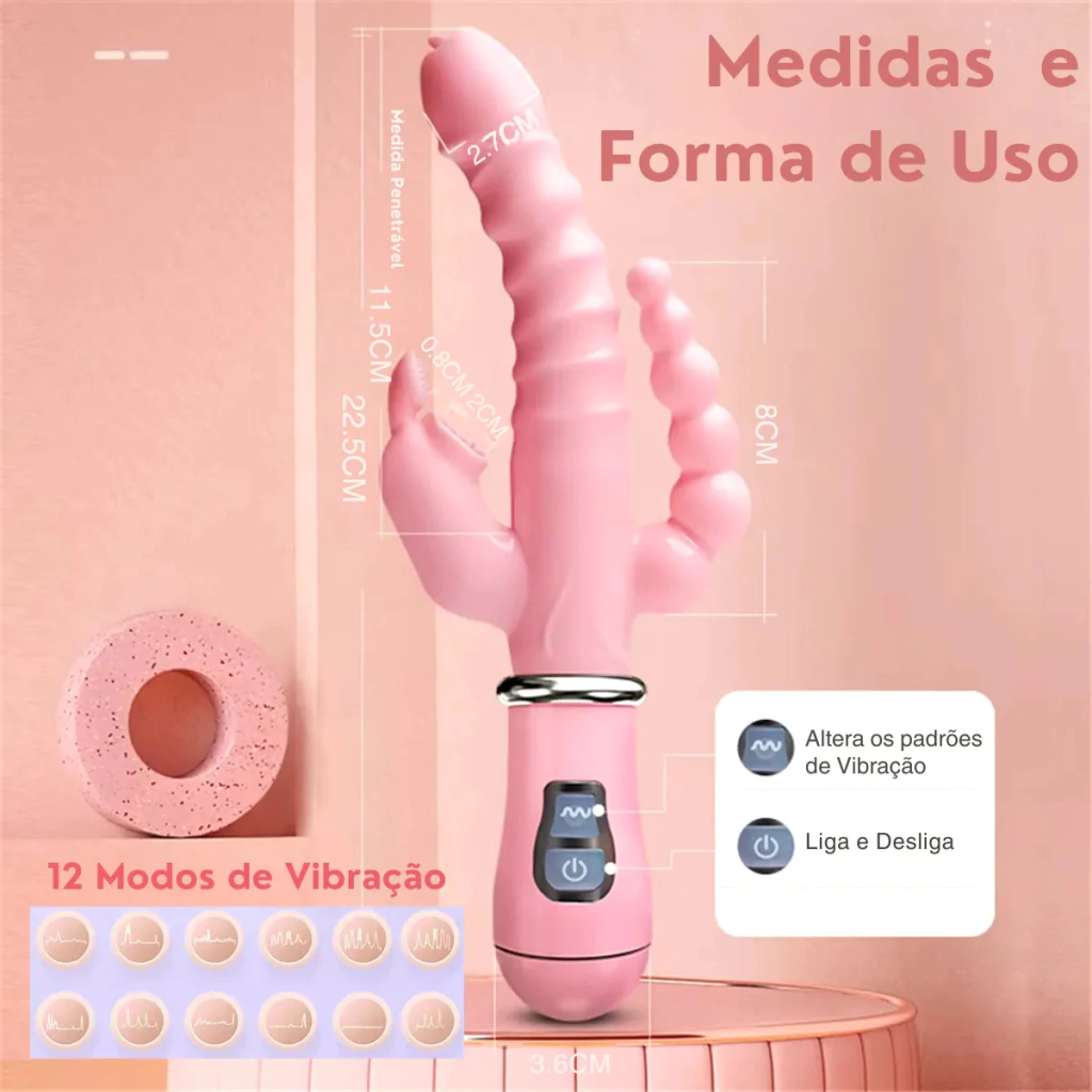 Conta com 12 modos de vibração, distribuídos entre três hastes ergonômicas: uma com formato em glande para penetração no ponto G, outra com cerdas vibratórias para estímulo clitoriano e uma terceira escalonada, desenvolvida para uso anal seguro e progressivo.