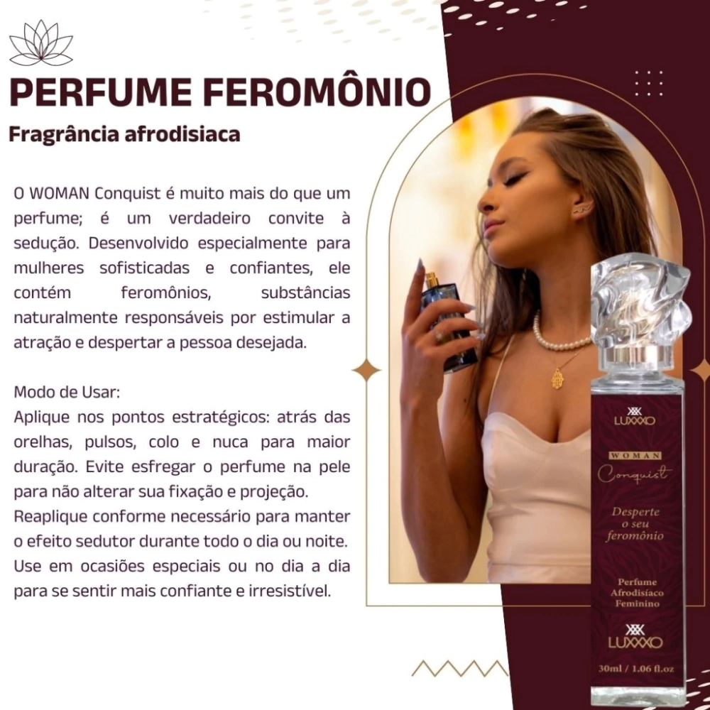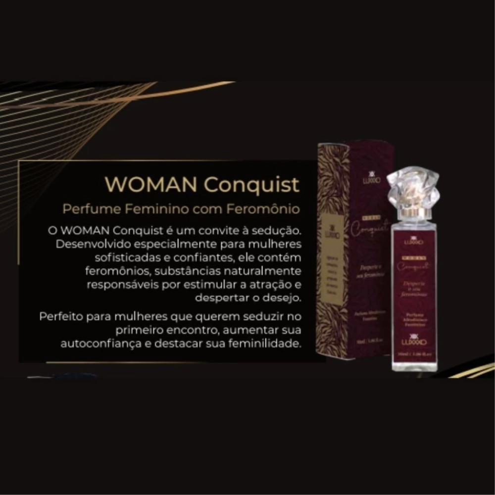 Apresente ao seu público o WOMAN Conquist – Luxxxo Cosméticos, um perfume feminino com feromônios naturais que eleva a experiência olfativa e o poder de atração. Ideal para revendedores que buscam um produto de alto apelo junto a mulheres modernas e confiantes, ele combina fórmula testada e fragrância duradoura com embalagem discreta.